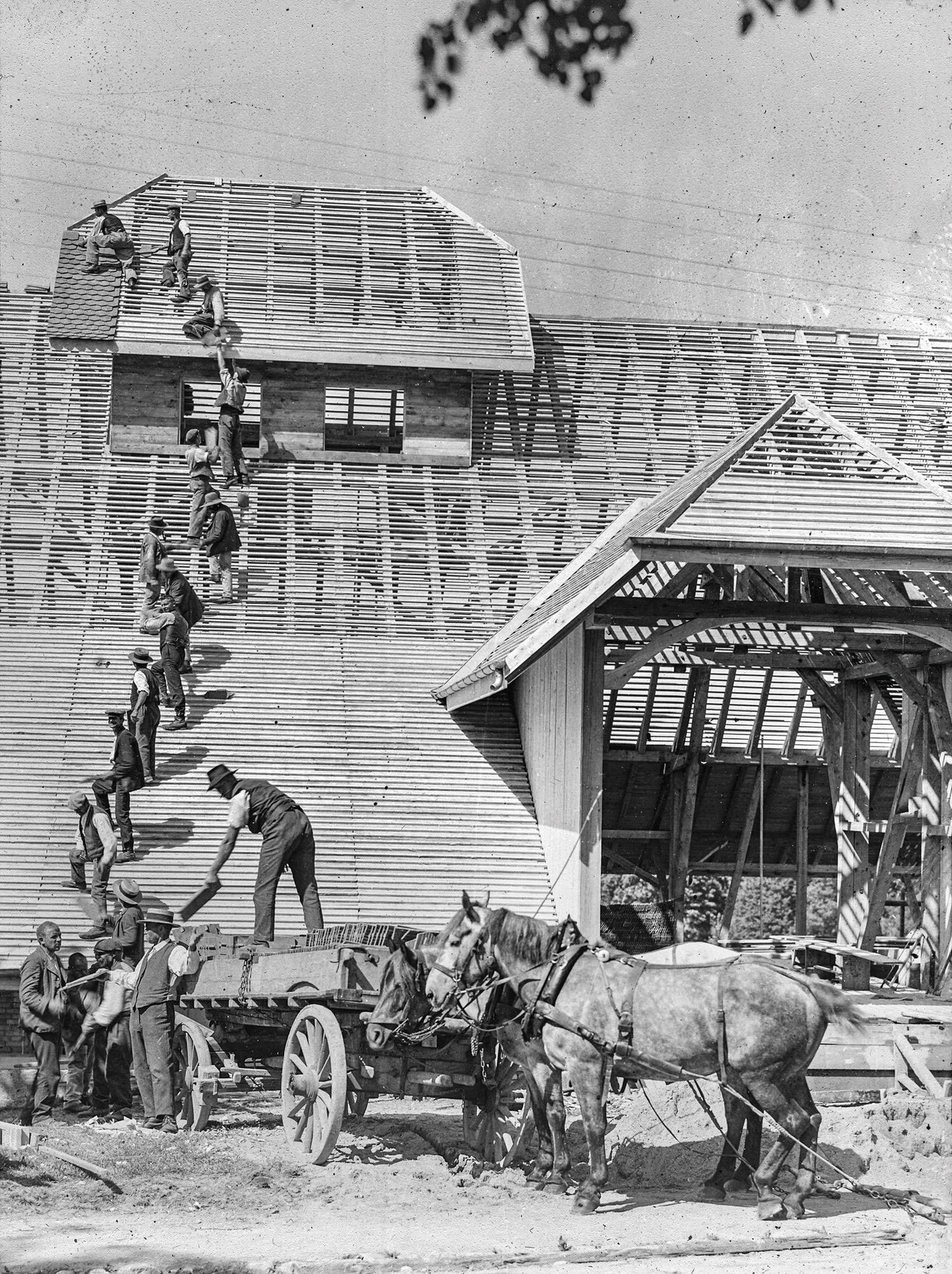 Patienten als Dachdecker, 1921, Neubau der Scheune nach einem Brand. Foto: Psychiatrie-Museum Bern