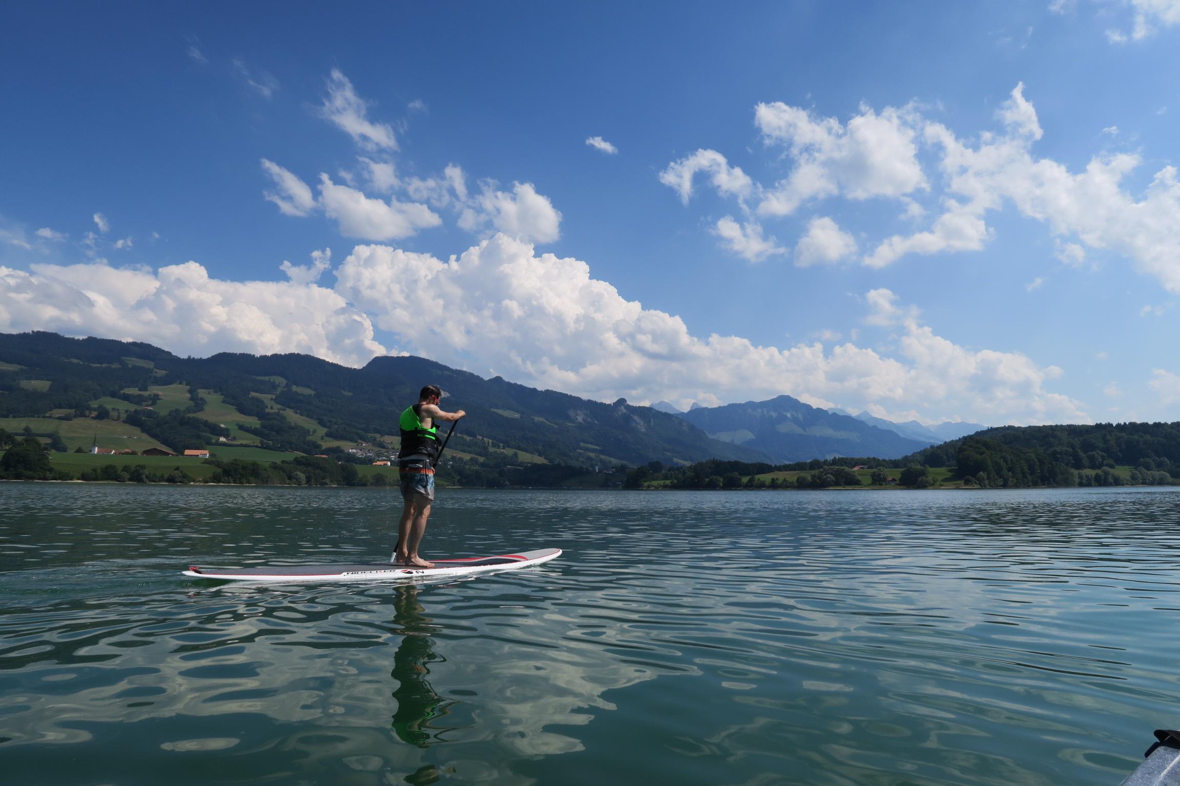 Aventure Gruyère bietet verschiedene Aktivitäten auf dem und um den Greyerzersee an. Sie können Kanus, Kajaks, Stand Up Paddles (SUP) und sogar Boote mieten.