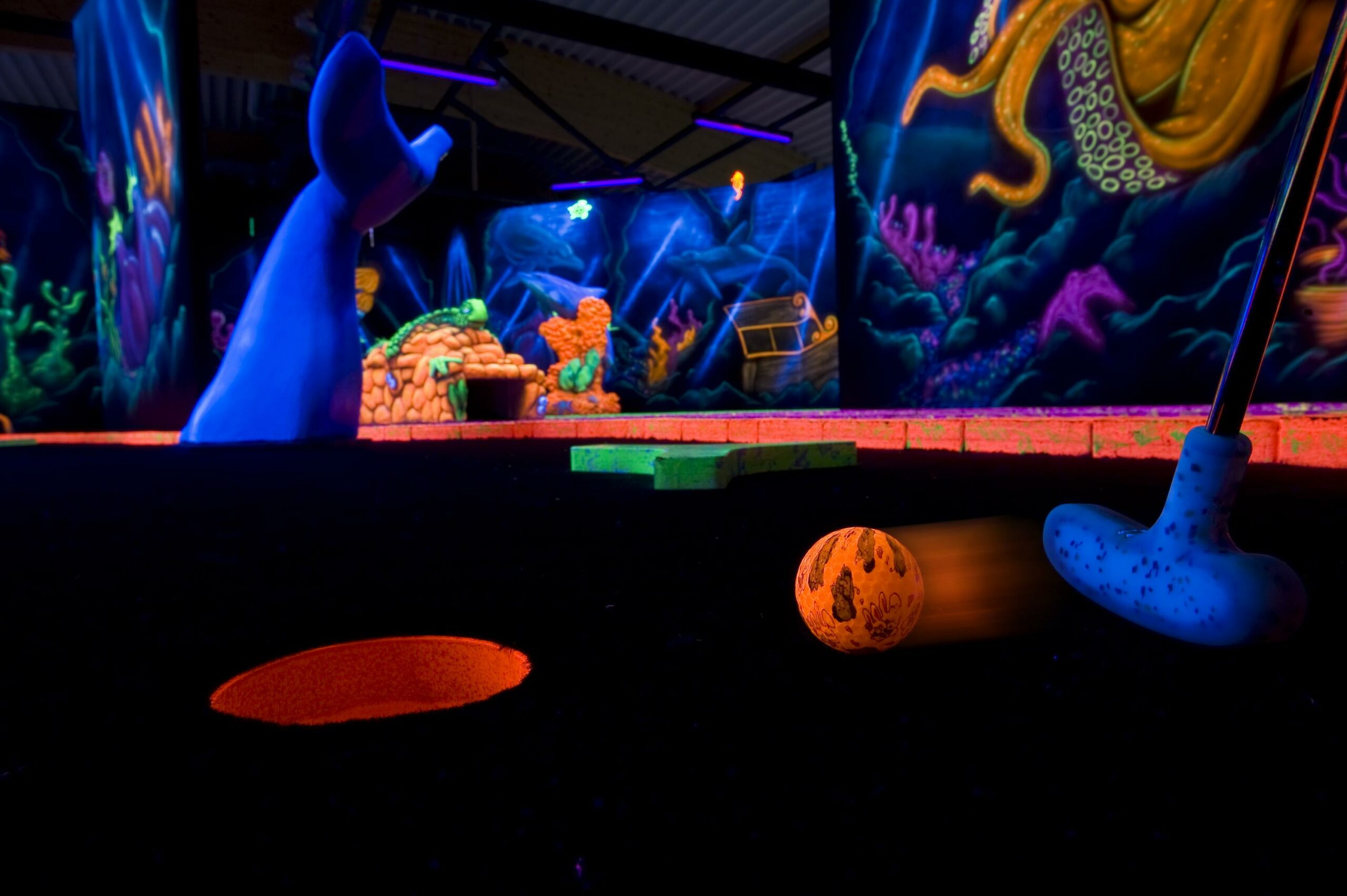 Schwarzlicht-Minigolf - Abschlag im Dunkeln Schwarzlicht-Minigolf – Abschlag im Dunkeln Offen von Dienstag bis Sonntag Weitere Informationen Link Webseite
